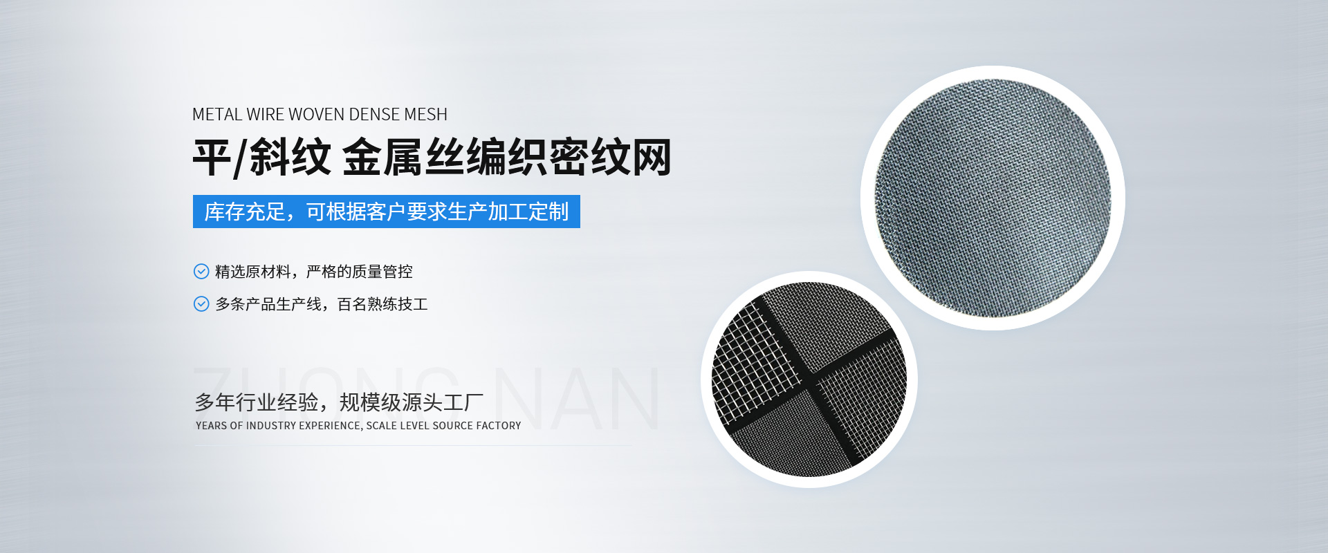 新鄉市中南金屬網有限公司成立于1999 年,公司設在河南省新鄉市。在過去的十幾年來,我們堅持以嚴格的管理措施、雄厚的技術力量、良好的工藝設施,質量上乘、信譽為上為原則,把樹立良好的企業形象為工作宗旨,歷經市場的嚴峻考驗并贏得廣大用戶的一致好評。金屬絲網編織結構形式有平紋和斜紋兩種方法,嚴格按照航空軍品標準HB1862—93和標準GB/T5330—2003標準,并等效采用國際標準ISO9044—90標準組織生產?! 」緭碛猩a設備和技術人員,主要生產不銹鋼篩網、磨料網、金屬絲編織方孔網、篩網、濾網 、篩分網 、過濾網、不銹鋼網、絲網、金屬絲網、金屬絲編織密紋網、特種網、不銹鋼密紋網、荷蘭網、席型網。絲網材質選用黃銅、錫青銅、不銹鋼、純鎳等。席型網規格7/44目—500/3500目,方孔網規格1/2目—500目,網孔25mm—0.028mm,產品廣泛用于機械、化工、化纖、石油、醫藥、橡膠、濾芯、固體果粒篩分、流體過濾以及裝飾、防塵、骨架支撐等?! ∥覀円浴耙曎|量為生命、以信譽求生存、以科技促發展、以優*產品為客戶服務”的經營理念,真誠的希望與各界人士攜手并進,共創輝煌!